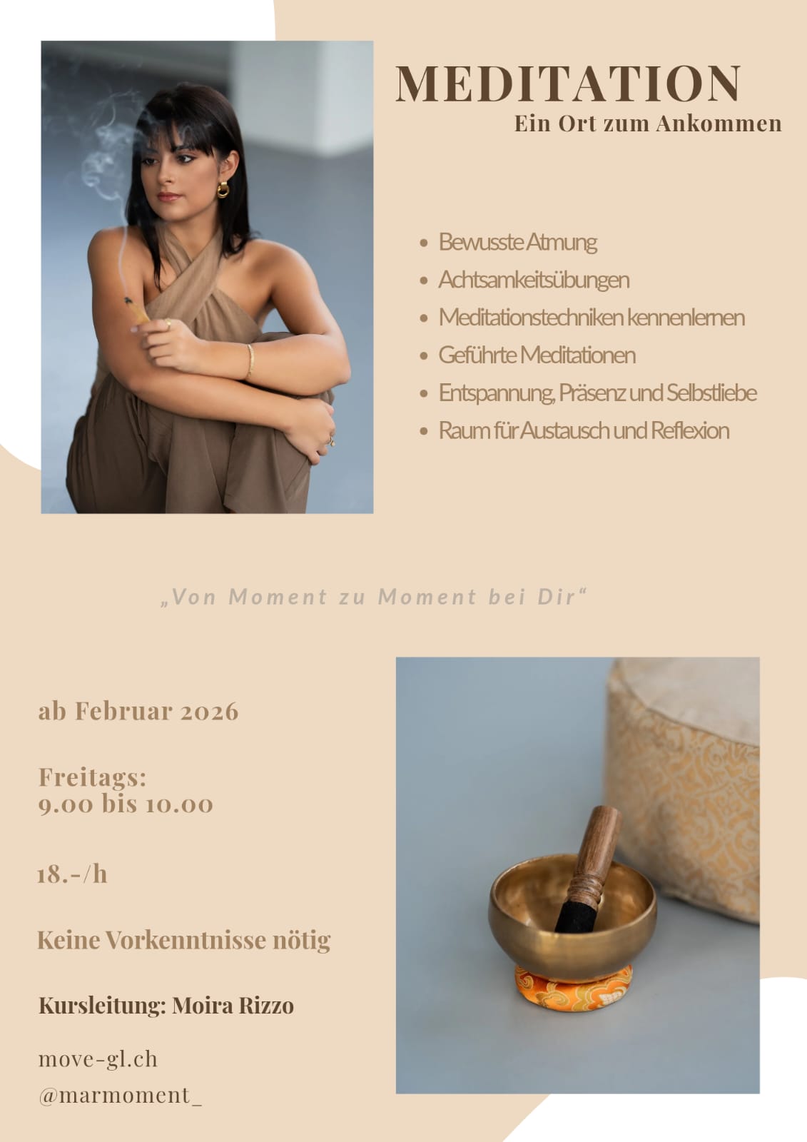 Meditation schafft genau diesen Raum. Einen geschützten Moment, um aus dem Aussen auszusteigen und nach innen zu lauschen. Den Atem wahrzunehmen, den Körper zu spüren und den Geist zur Ruhe kommen zu lassen. Ohne Druck, ohne Ziel, ohne Bewertung.